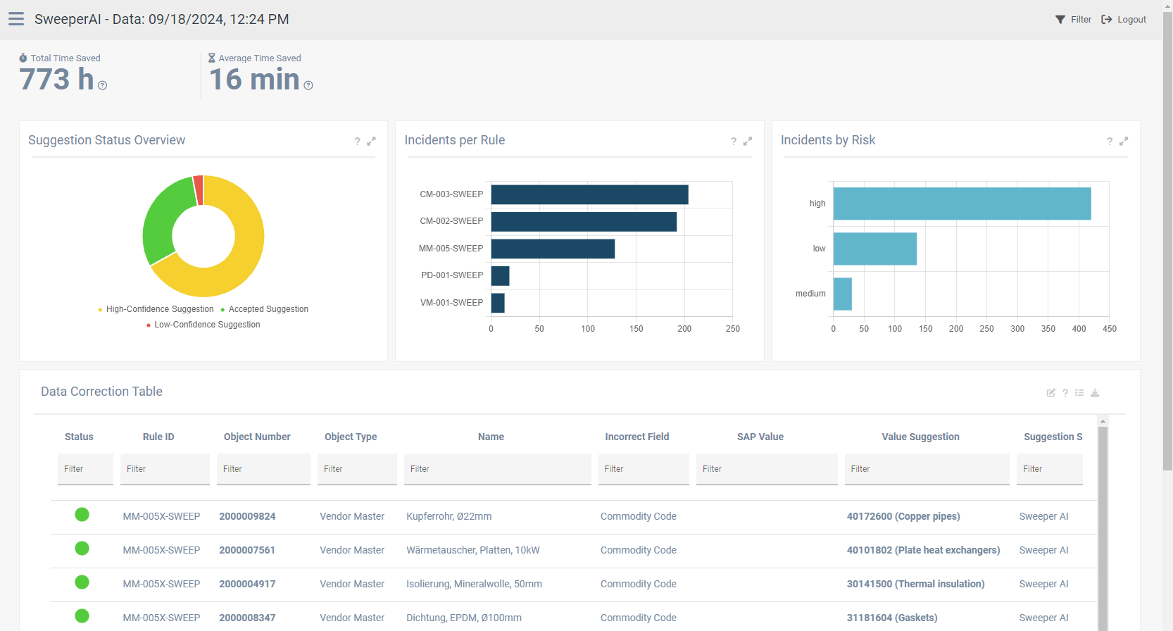 Imagine a world where your data is always accurate with minimal efforts thanks to AI assistance. With Sweeper AI, you can quantify and resolve the cost of damage due to bad data quality and furthermore reduce the cost of cleansing to create tangible business value, leading to a competitive advantage in your industry. Cost of damage are the costs created down the road by data errors. As an example, incorrect material master data inherits the errors to transactional data such as purchase orders, which then leads to process errors or manual fixing efforts. In the context of material planning parameters, the risk can even be more drastic. While suboptimal planning parameters can produce excess stock tying up working capital, missing or incorrect data like the material supply strategy can lead to unexpected line stoppages and production disruptions. To prevent this, the data errors must be corrected by employees, which produces a cost of cleansing.